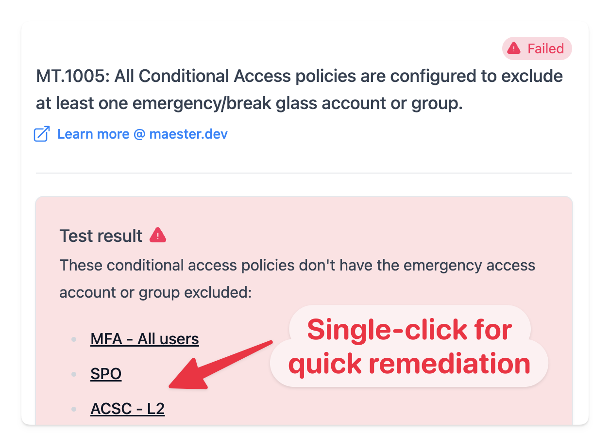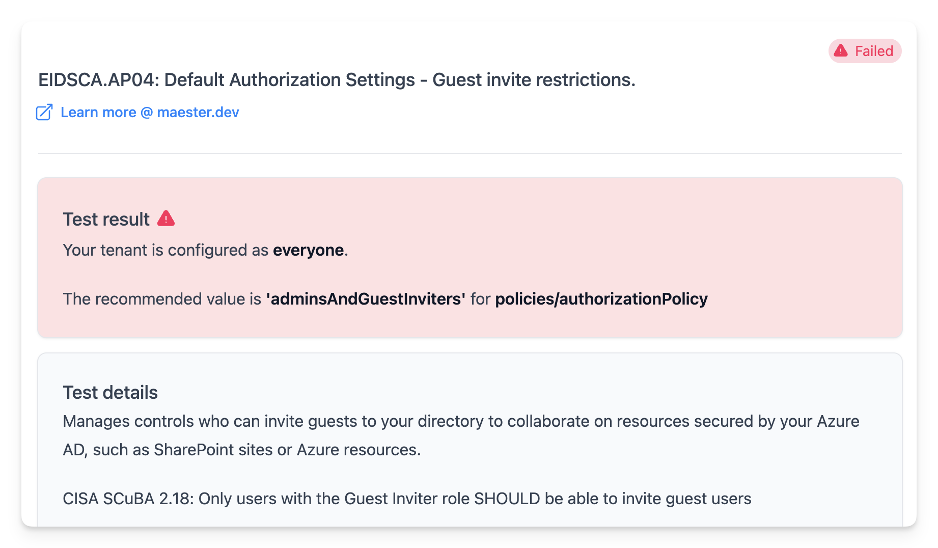 Each test in Maester comes with details of the configuration settings and guidance on how to remediate any issues found.